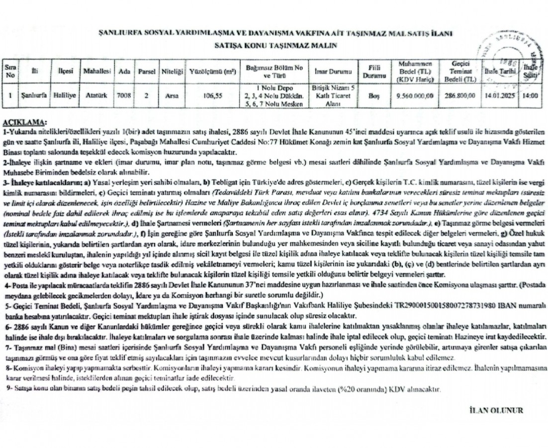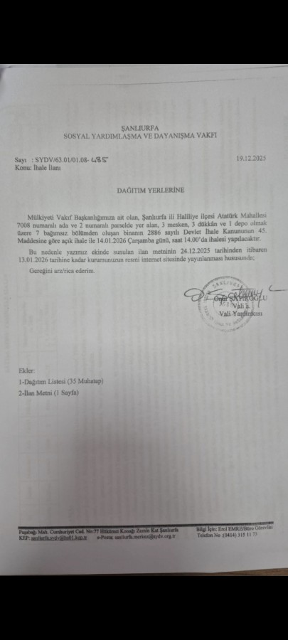 Sosyal Yardımlaşma ve Dayanışma Vakfı İhale İlanı