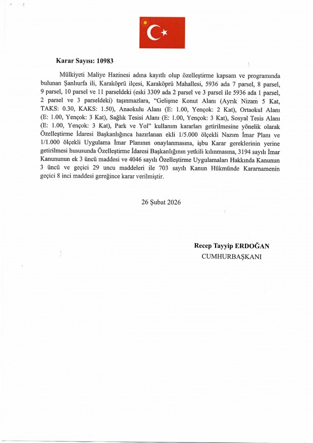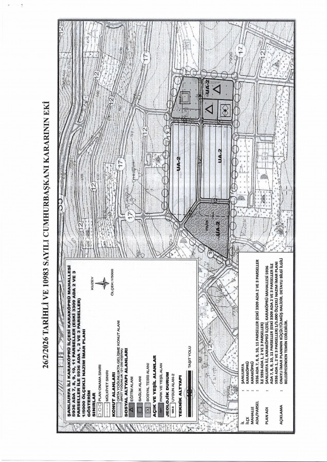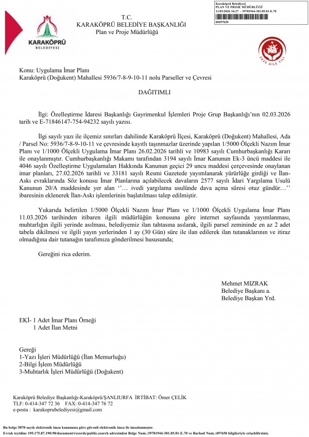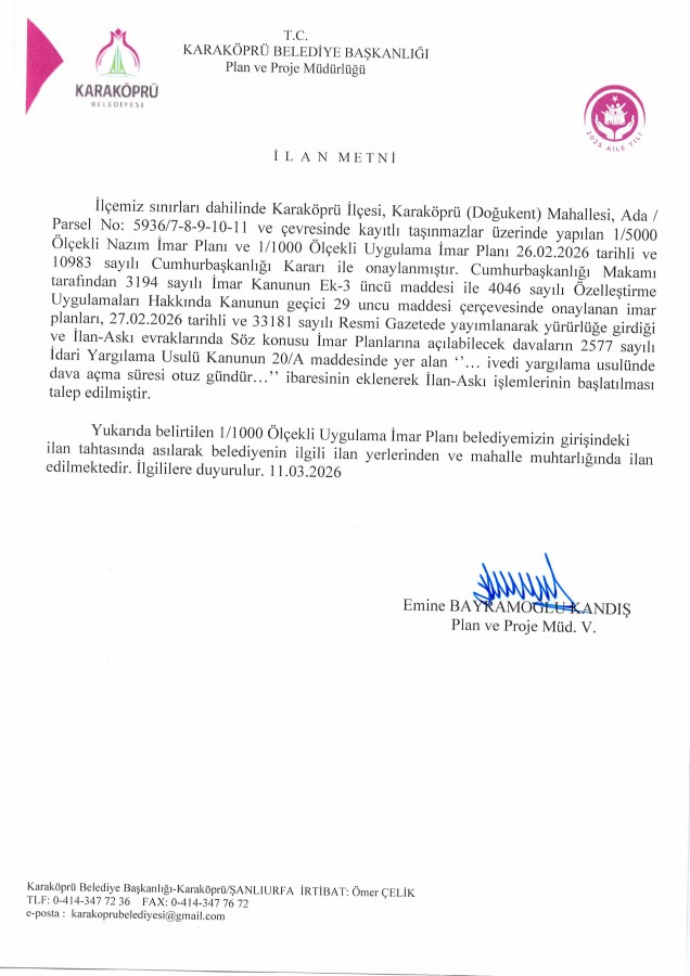 • Uygulama İmar Planı Karaköprü (Doğukent) Mahallesi 5936/7-8-9-10-11 nolu Parseller ve Çevresi İlanı